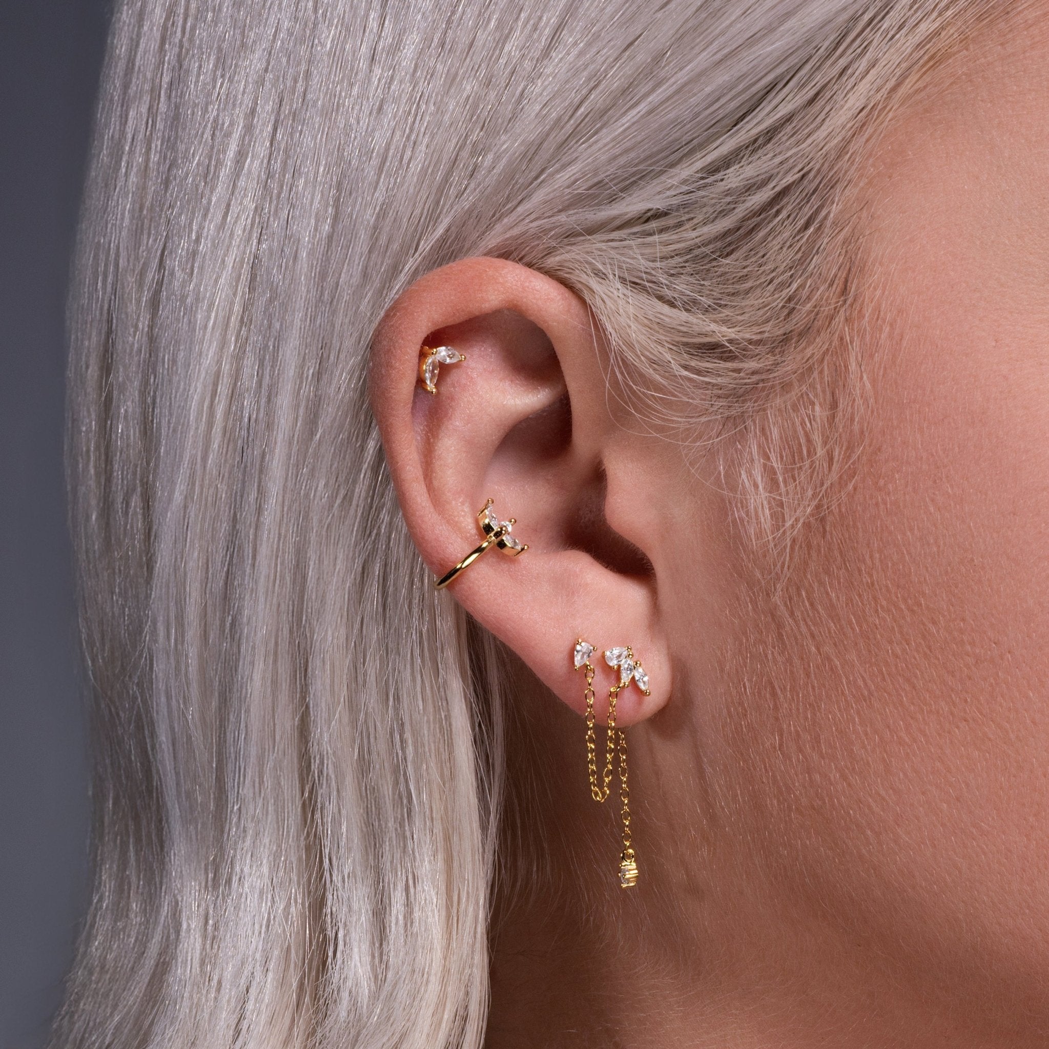 La boucle d'oreille Chloé 💫, avec sa délicate chaîne et ses cristaux scintillants, incarne une élégance audacieuse. Conçue pour sublimer le lobe avec deux trous, elle offre un jeu de lumière raffiné qui attire tous les regards. Idéale pour sublimer vos compositions.